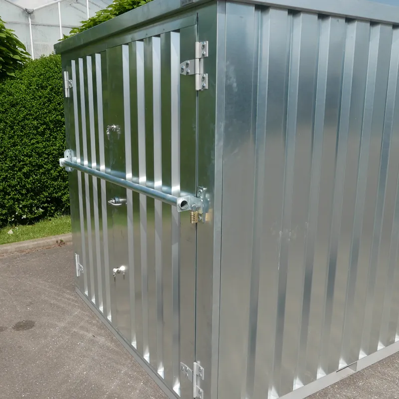 La barra antirrobo puede utilizarse para contenedor almacenaje con una puerta simple y una puerta doble en el lado corto. Esta barra de seguridad tiene que ser fijada mediante la fijación de las piezas laterales al contenedor desmontable, después de lo cual la barra puede ser fijada a él y bloqueada con un candado o una cerradura de cilindro.